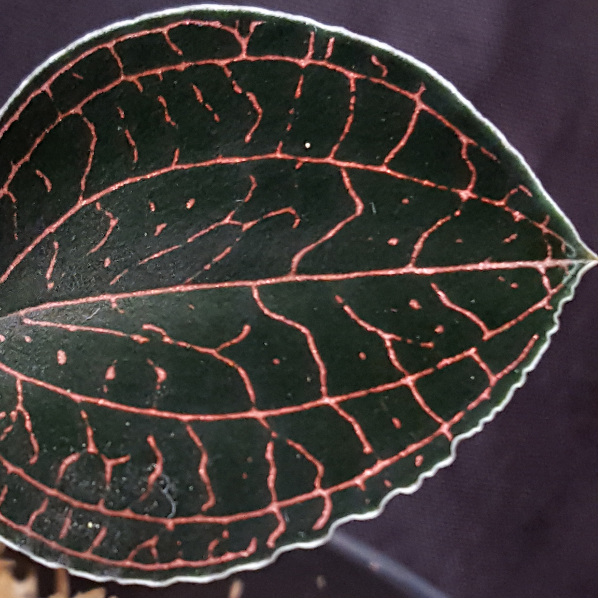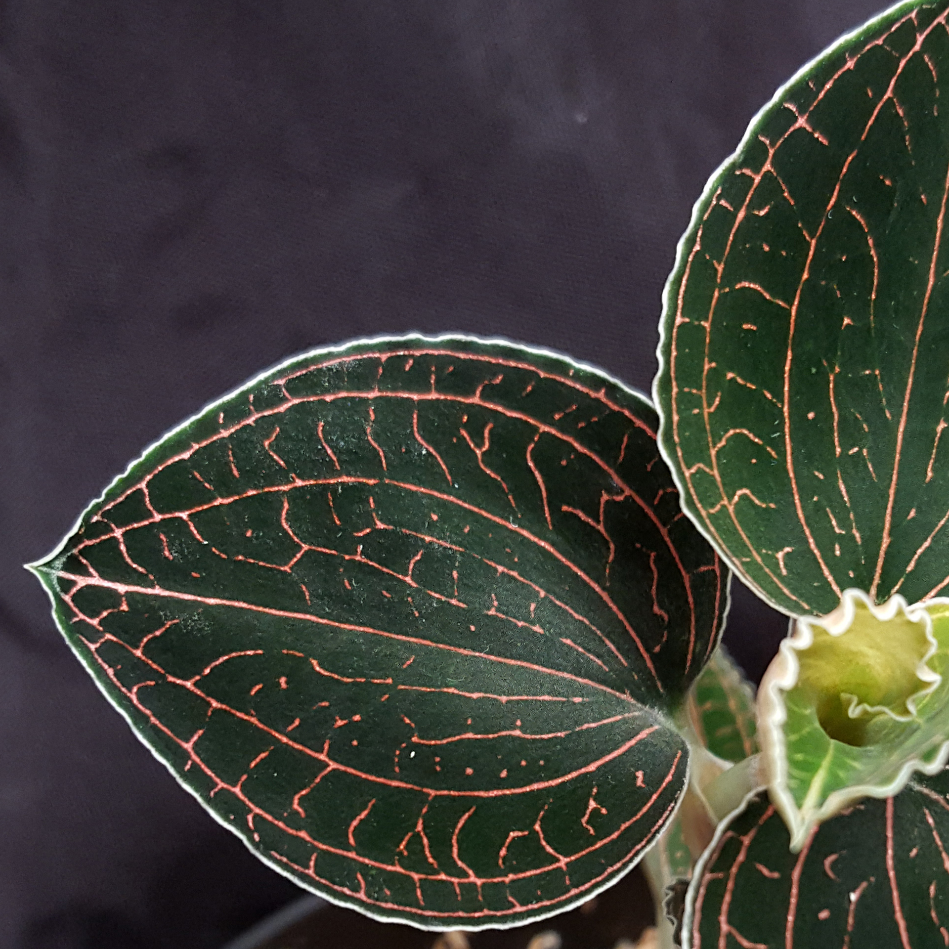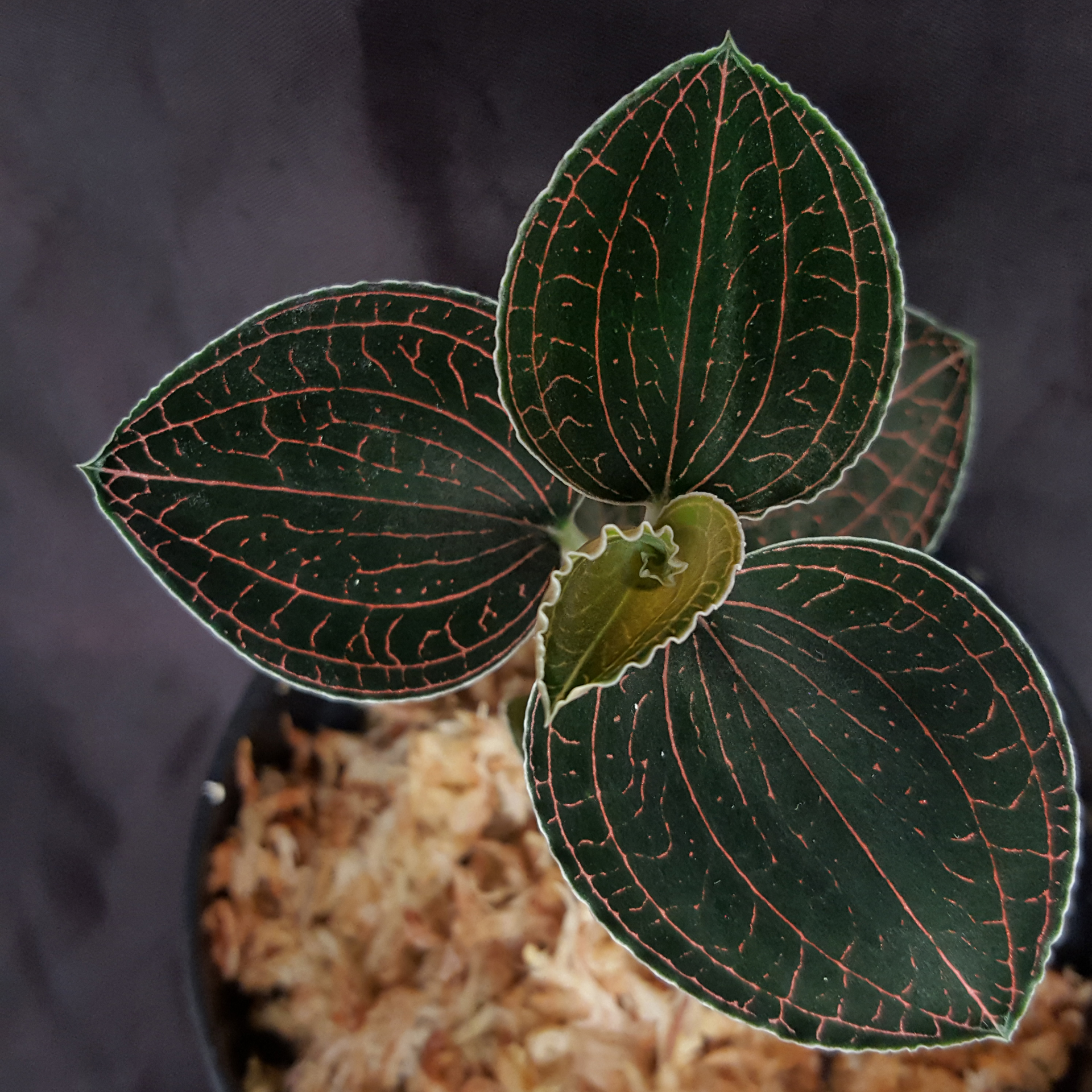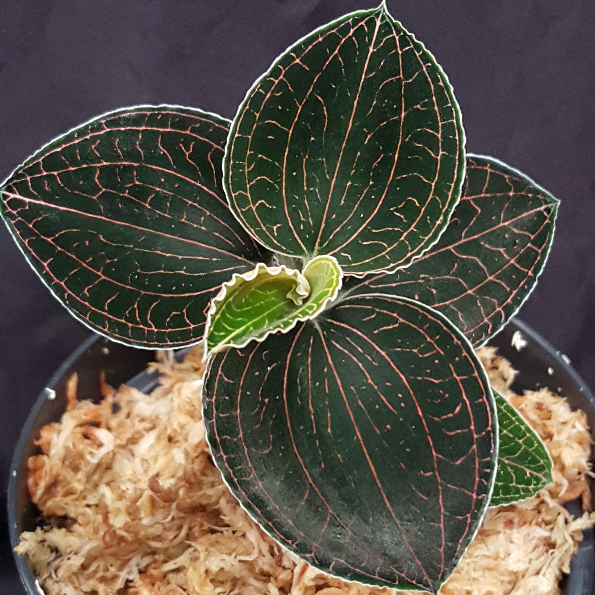 Reddish veins run through the dark, almost black leaves of the small Anoectochilus brevilabris ‘White Veil’ Lindl. 1840, creating a beautiful contrast. It is found in the eastern Himalayas, in Bhutan and in India in Assam. This Asian jewel orchid feels at home in temperatures that you also feel comfortable in. It thrives in the shade of forests and is therefore perfectly adapted to low light conditions. Direct sunlight is detrimental to it and leads to bleaching of the leaves. The roots must grow in a well-aerated, constantly moist substrate. Waterlogging is very likely to kill it. Please also fertilise sparingly and only use rainwater for watering if possible. The pictures shown are examples, the plant you purchase is similar to the pictures.