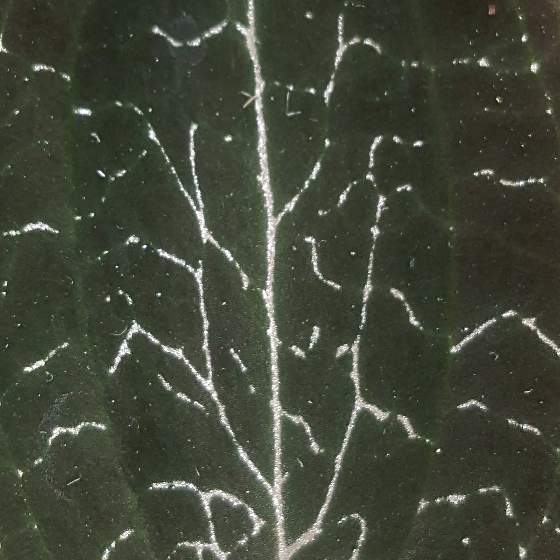 Silver veins stand out on dark leaves with a strong