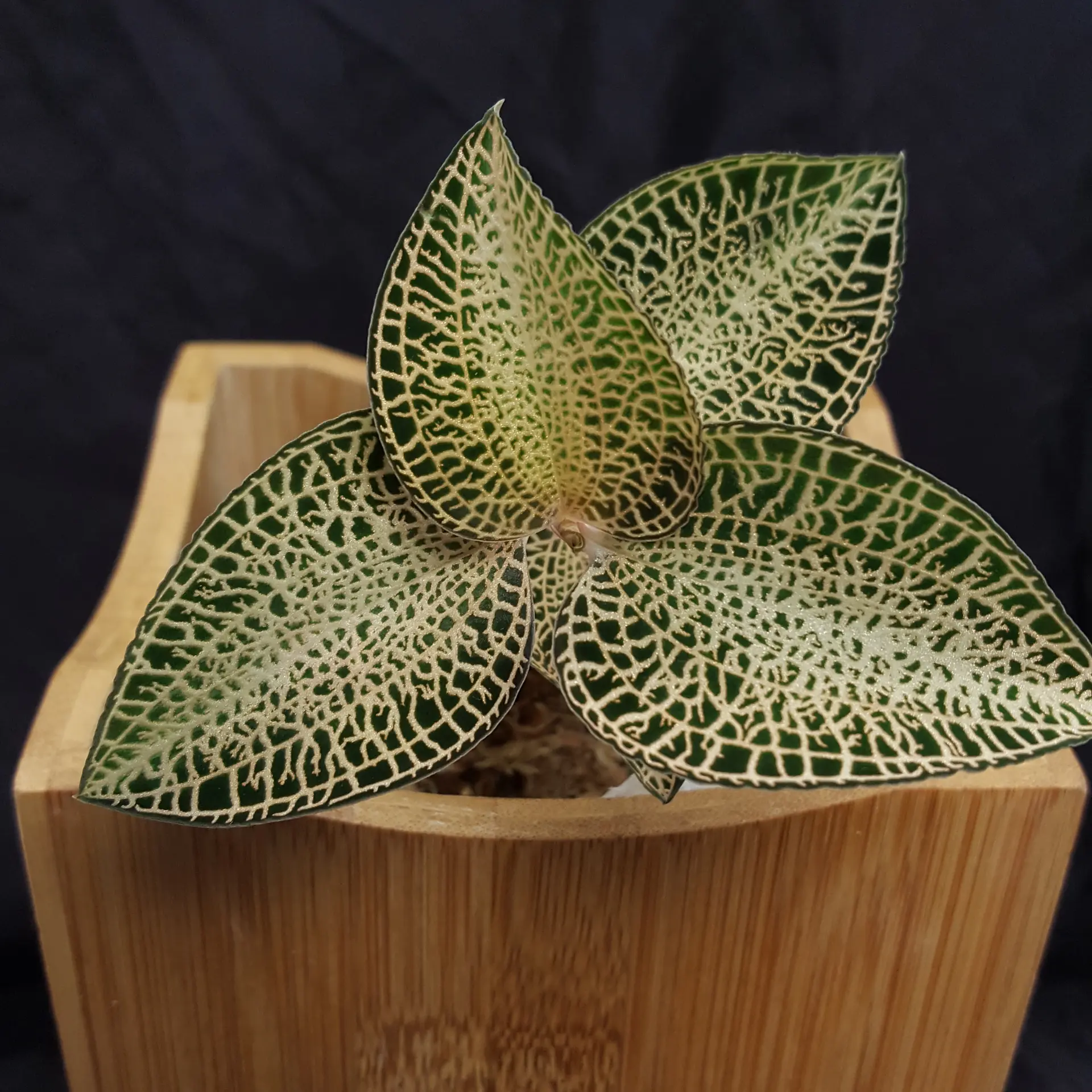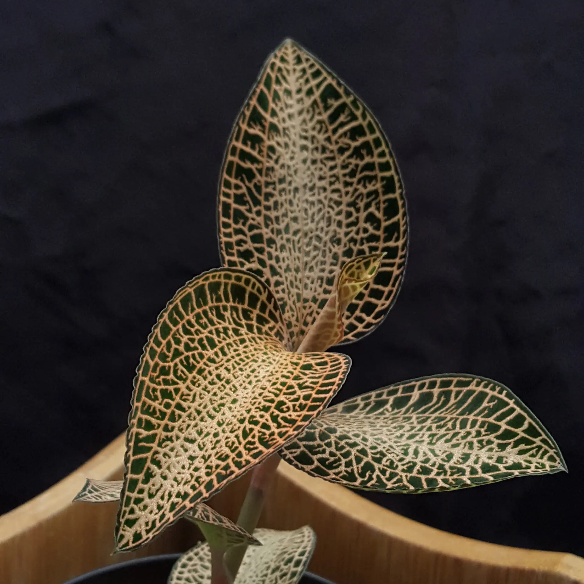 It is quite impressive how the gold-coloured veins of the Anoectochilus roxburghii ‘Golden Fleece’ run across the leaf surface of this jewel orchid. It is almost impossible to capture this play of colours on camera, but I hope that you will be enchanted by the pictures. Anoectochilus roxburghii ‘Golden Fleece’ is a variety selected in Japan. It will certainly be a highlight in your jewell orchid collection. Please avoid direct sunlight and wet substrate. Most jewel orchids die if their roots are wet. In their natural environment, the roots, which are covered with an extraordinary amount of root hairs, grow in the top litter layer of the forest floor. Anoectochilus roxburghii ‘Golden Fleece’ thrives in temperate conditions, i.e. feels at home at normal room temperature. In Asia it is known as the queen of medicinal herbs. The pictures shown are examples, the plant you purchase is similar to the pictures.