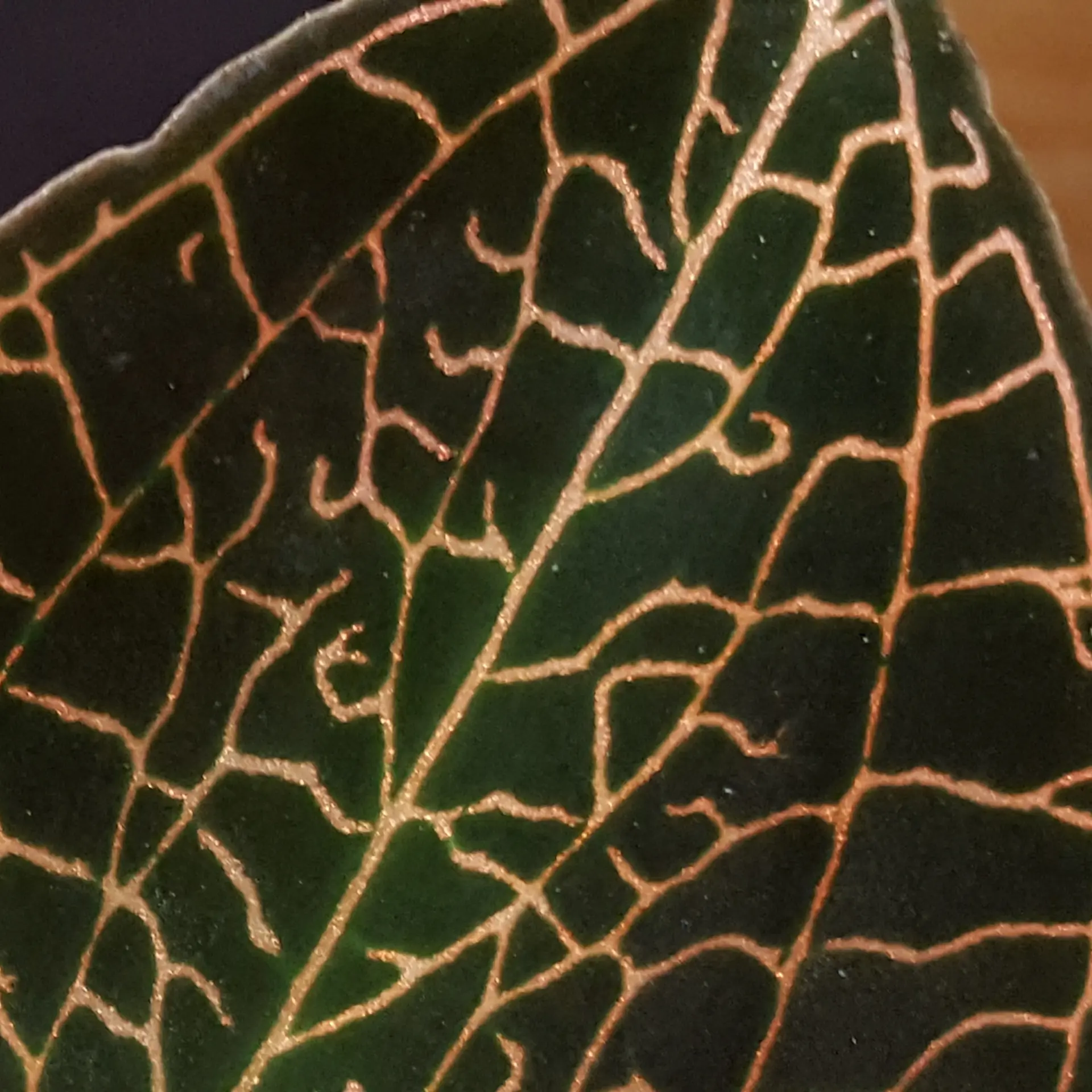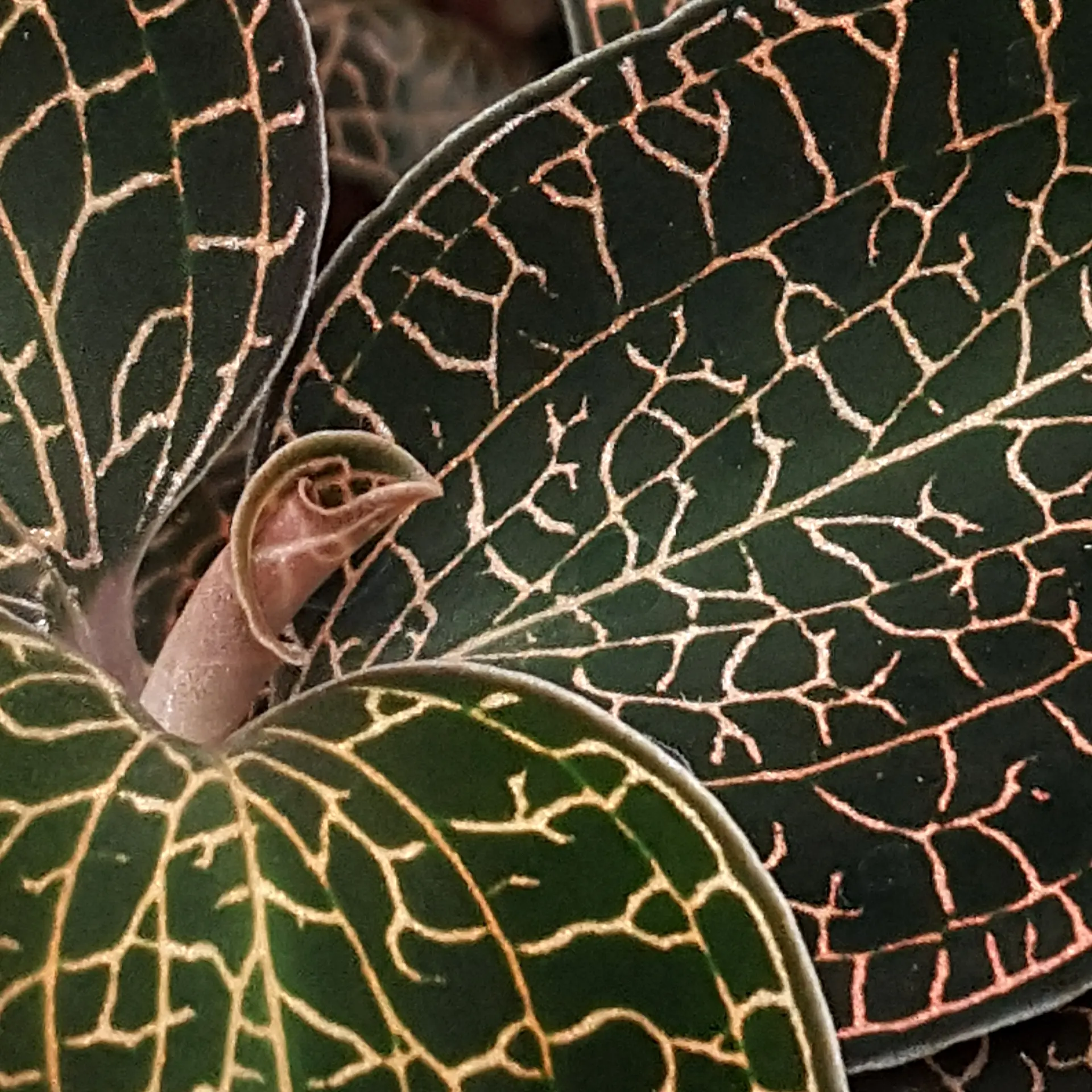 The golden-red veins of the jewel orchid Anoectochilus roxburghii ‘Salmon Dream’ stand out like small lava flows on the dark leaf base. What sparkles so conspicuously in the light is a good camouflage in the shade of the forest trees. Botanists assume that the leaf colouring that inspires us so much is a form of frass protection in the wild. Anoectochilus roxburghii ‘Salmon Dream’ does well in no direct sunlight, no waterlogging and little fertiliser at room temperature. Suitable for both beginners and advanced enthusiasts. The pictures shown are exemplary, the plant you purchase is similar to the pictures.