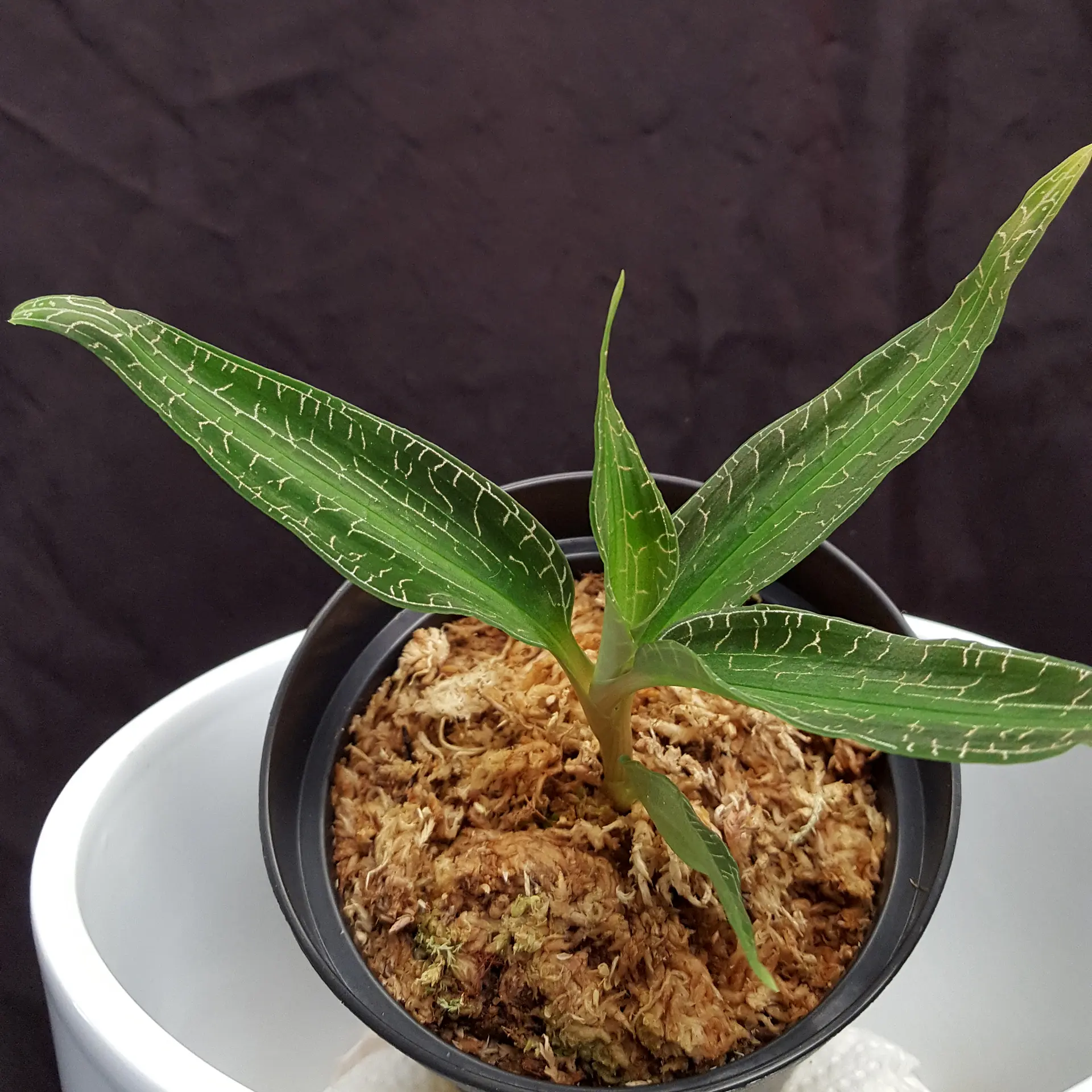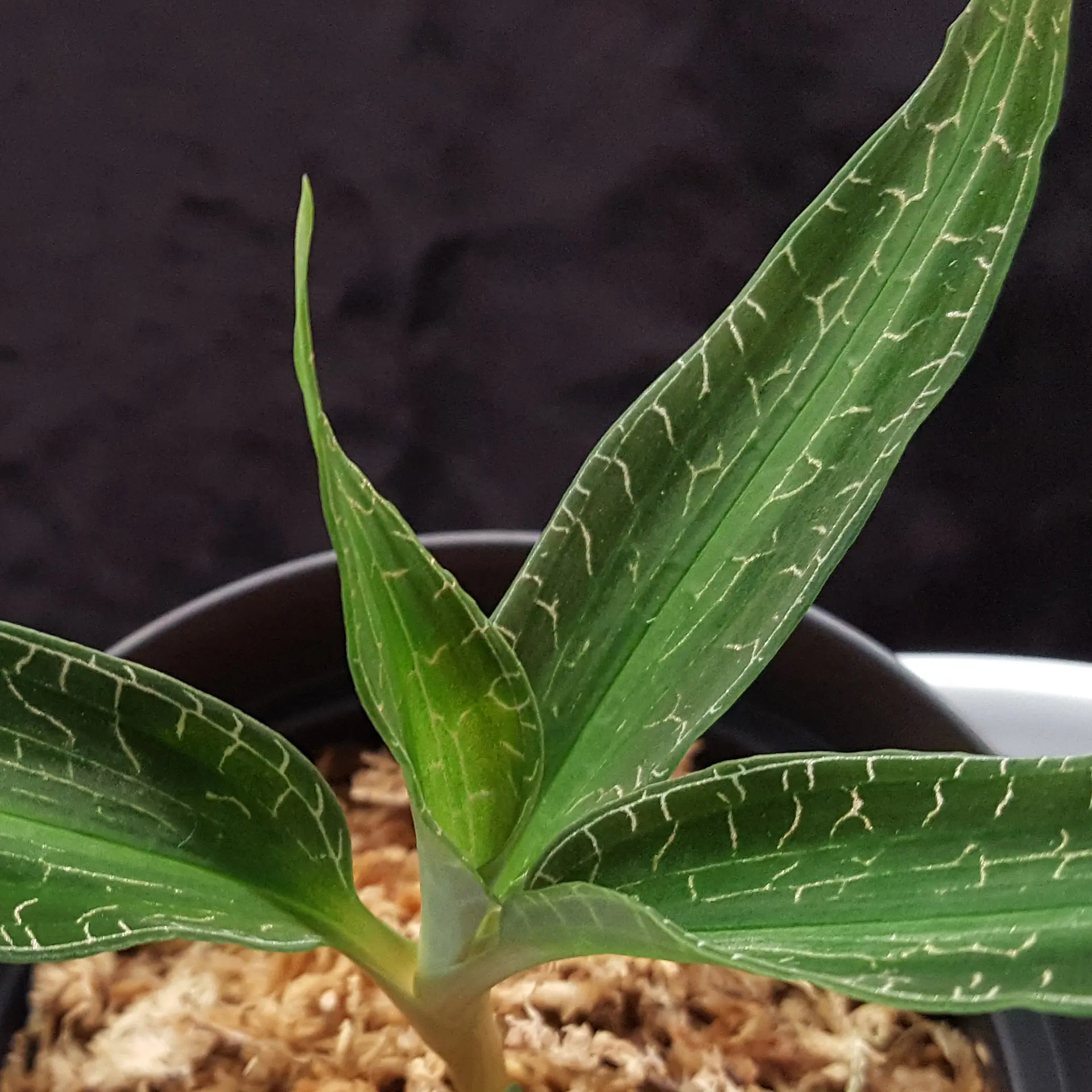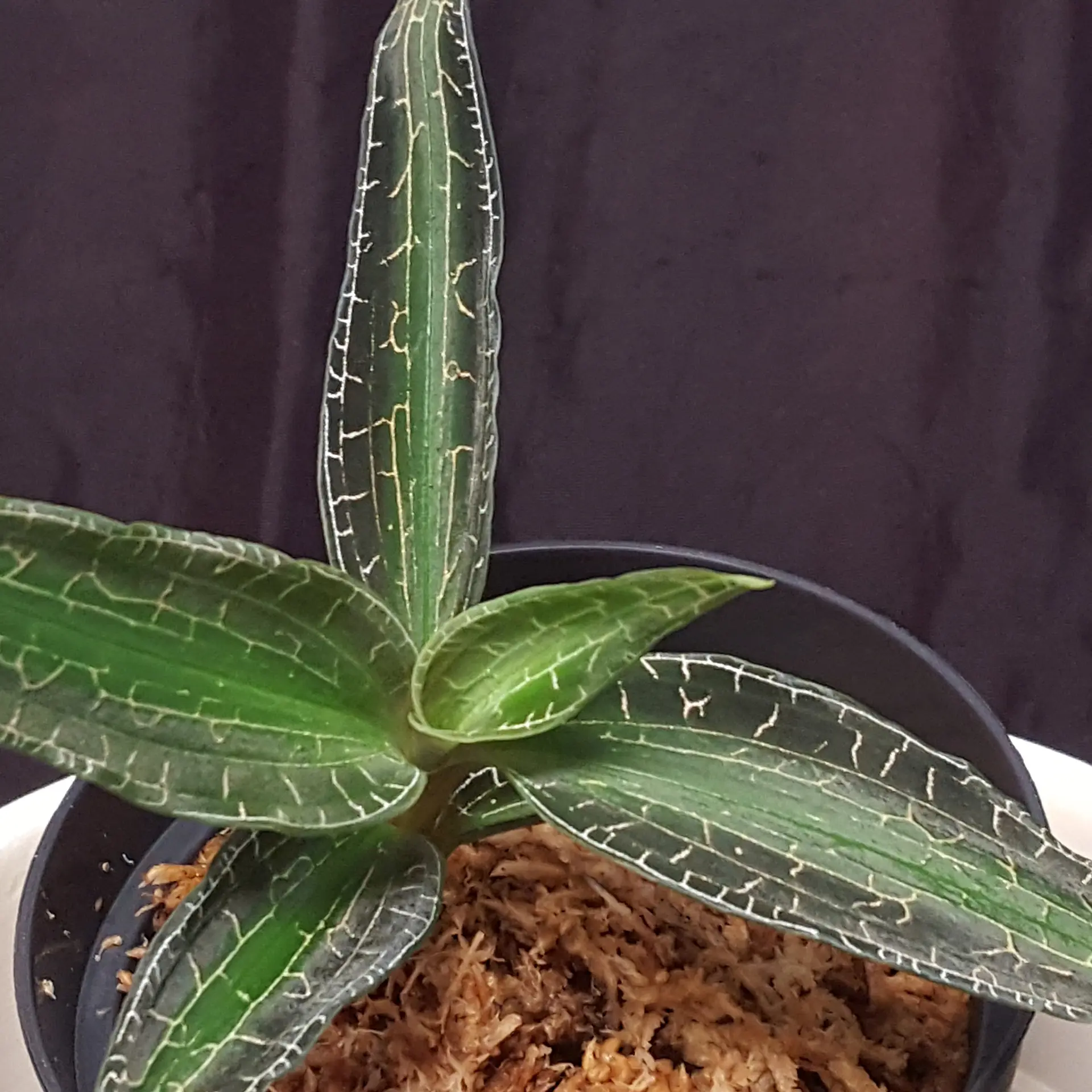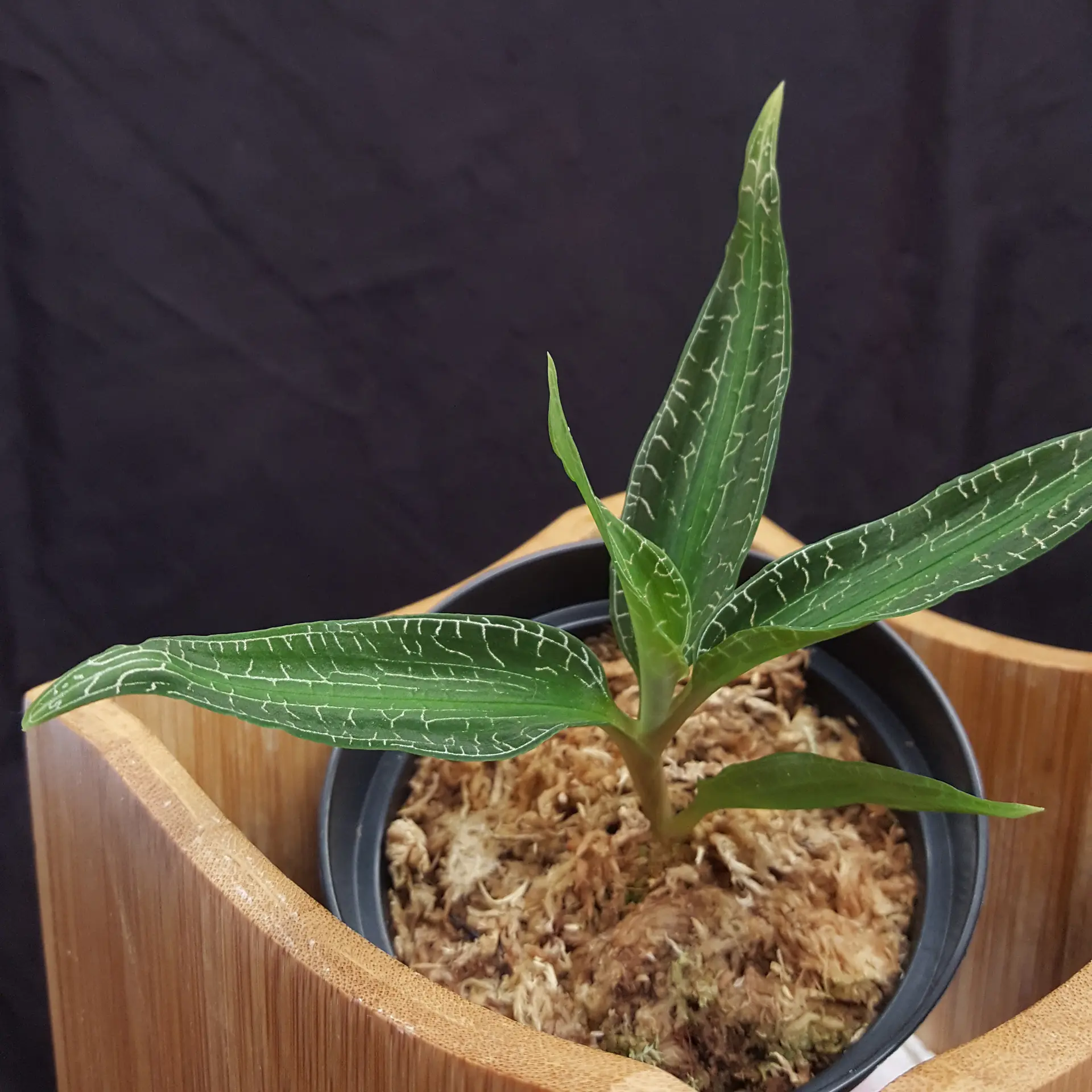 Goodyera malipoensis ‘Yellow Sea’ is only rarely offered within the European Union. It is an impressive jewel orchid with elongated, pointed leaves. The silver threads of its leaf veins give this jewel orchid an unmistakable appearance. Goodyera malipoensis Q.X.Guan & S.P.Chen 2014 was only described in 2014 and originates from the Chinese province of Yunnan. There it grows in moist, shady places and prefers rather temperate to cool temperatures, so it can be kept well in a cooler bedroom, for example at a north-facing window. The Sphagnum moss should always be moist, but never dripping wet. We keep it at room temperature, which seems to suit it well. The genus Goodyera consists of around 100 species, 29 of which are found in China. The pictures are to be understood as an example, you will receive a similar plant.