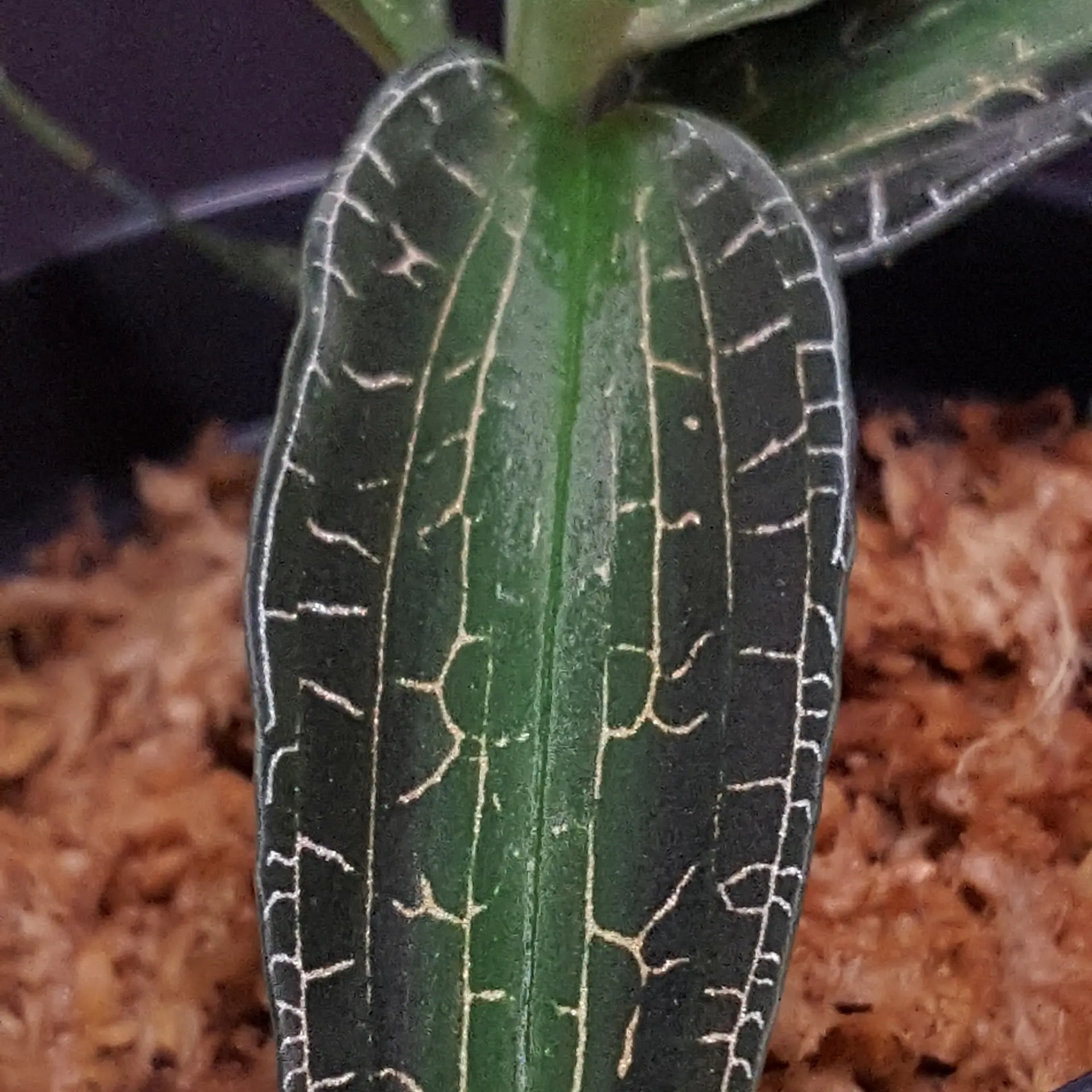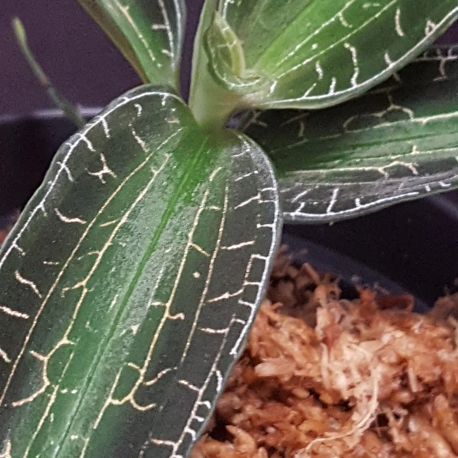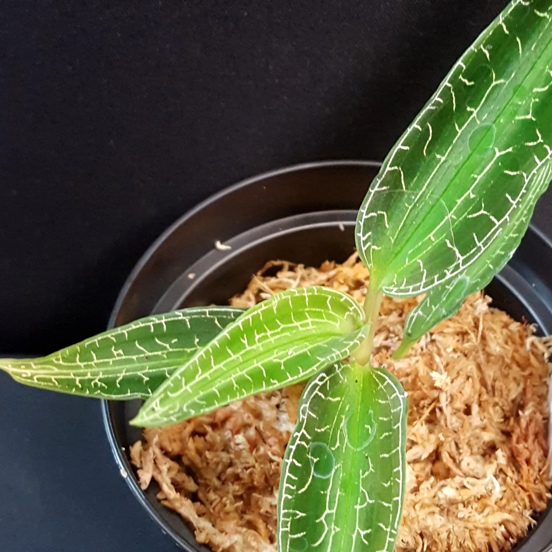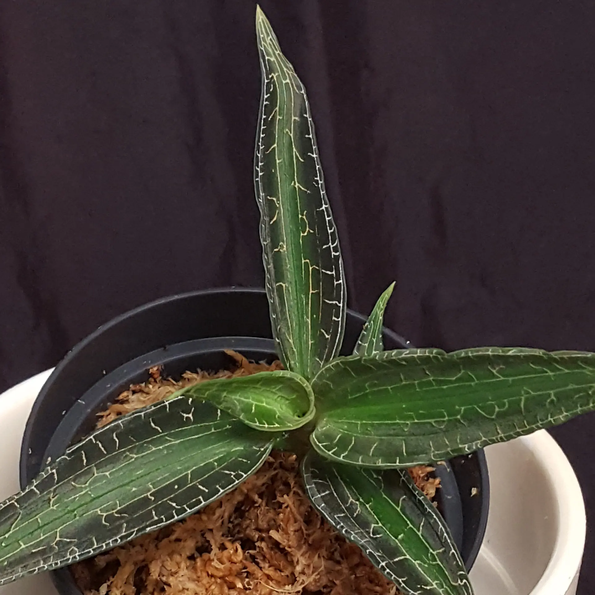 Goodyera malipoensis ‘Yellow Sea’ is only rarely offered within the European Union. It is an impressive jewel orchid with elongated, pointed leaves. The silver threads of its leaf veins give this jewel orchid an unmistakable appearance. Goodyera malipoensis Q.X.Guan & S.P.Chen 2014 was only described in 2014 and originates from the Chinese province of Yunnan. There it grows in moist, shady places and prefers rather temperate to cool temperatures, so it can be kept well in a cooler bedroom, for example at a north-facing window. The Sphagnum moss should always be moist, but never dripping wet. We keep it at room temperature, which seems to suit it well. The genus Goodyera consists of around 100 species, 29 of which are found in China. The pictures are to be understood as an example, you will receive a similar plant.