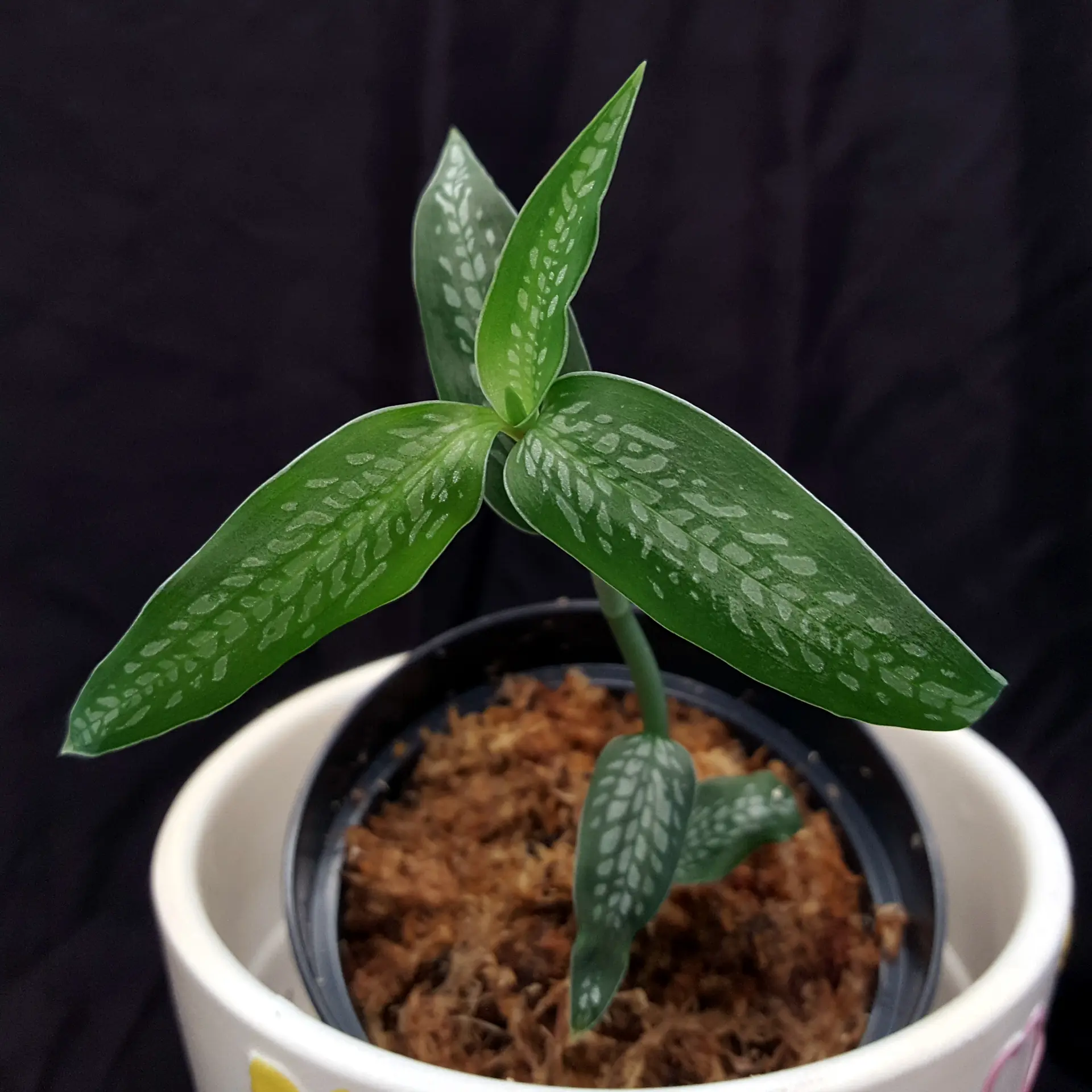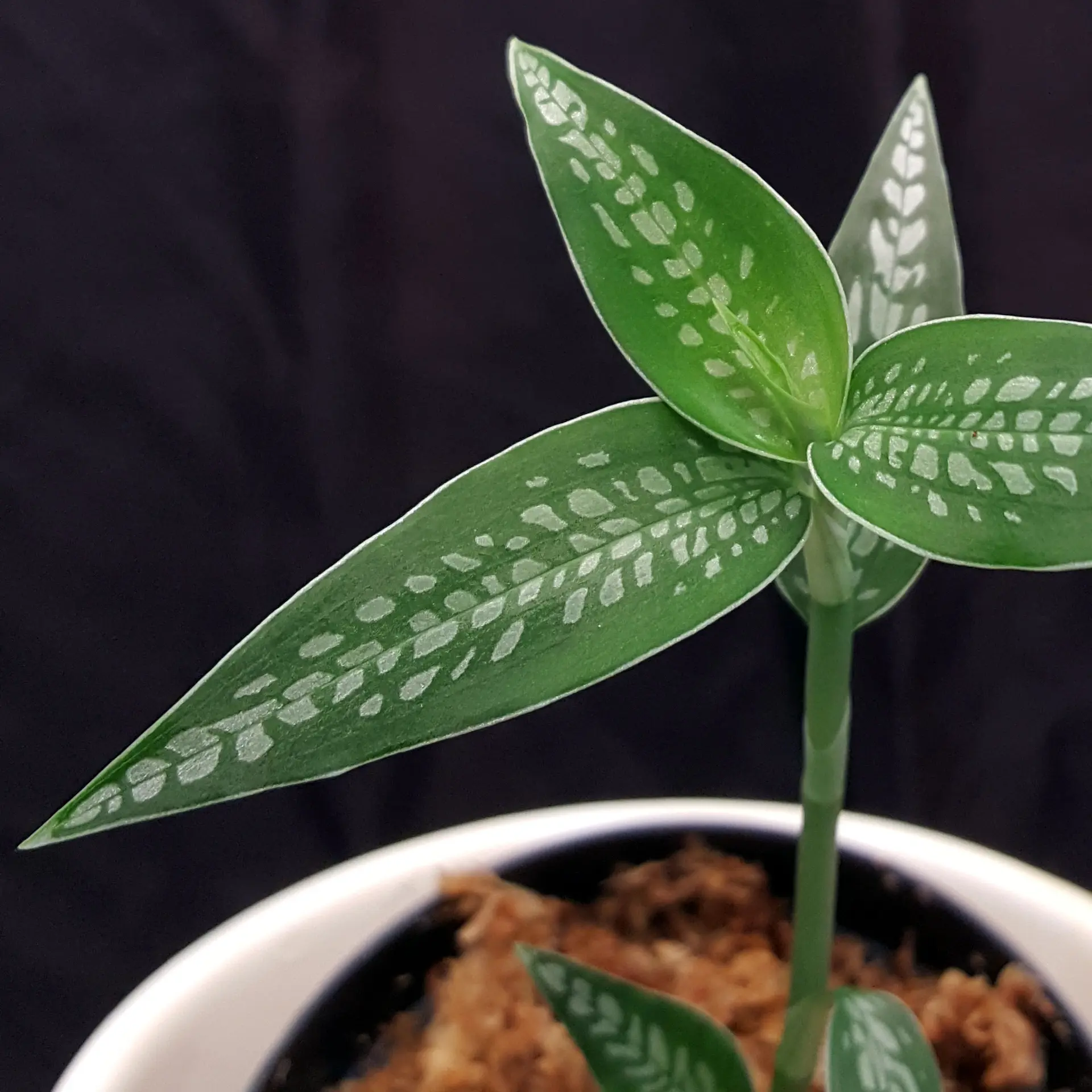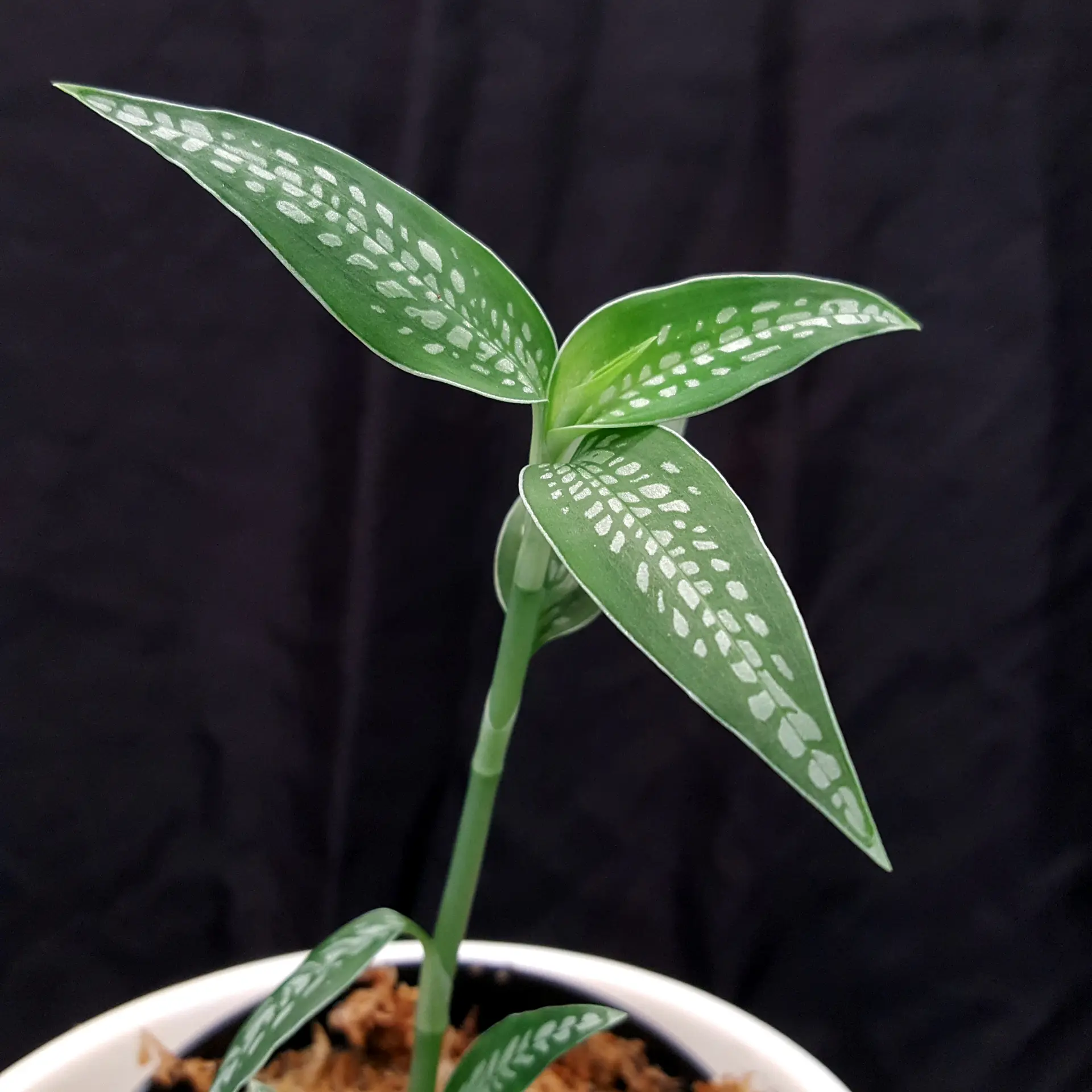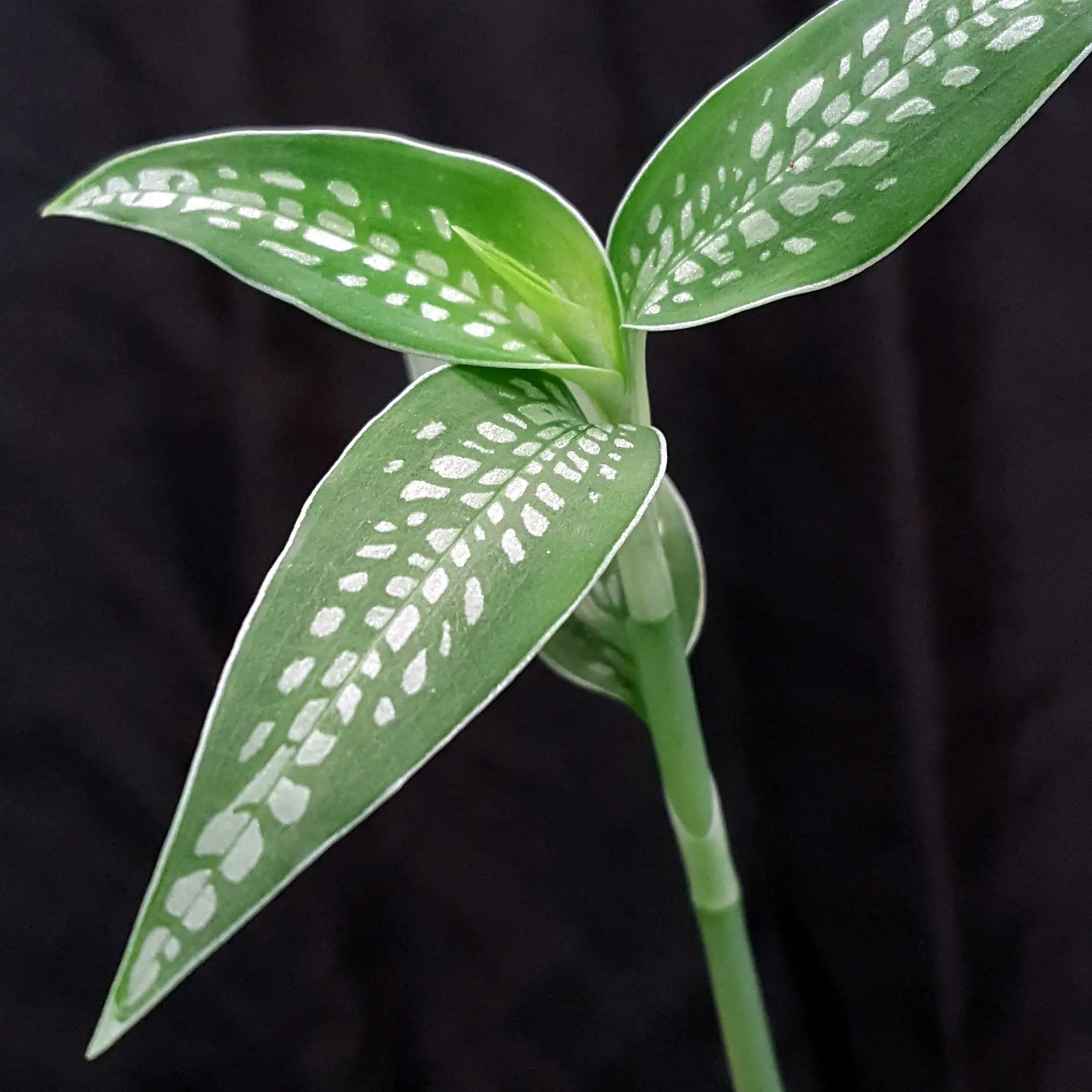 This jewel orchid truly belongs in the spotlight: Platythelis maculata ‘Spotlight’ (Hook.) Garay 1977. This South American jewel orchid is rarely offered, so I am all the more pleased to send you some strong plants. The teardrop-shaped leaf markings glisten beautifully in a silver colour when the light falls on them correctly. Room temperature and plenty of light, but no direct sunlight, are just right for this species. A magnifying glass is recommended to take a closer look at the flowers ... the individual flowers are quite small. The pictures shown are exemplary, the plant you purchase is similar to the pictures.